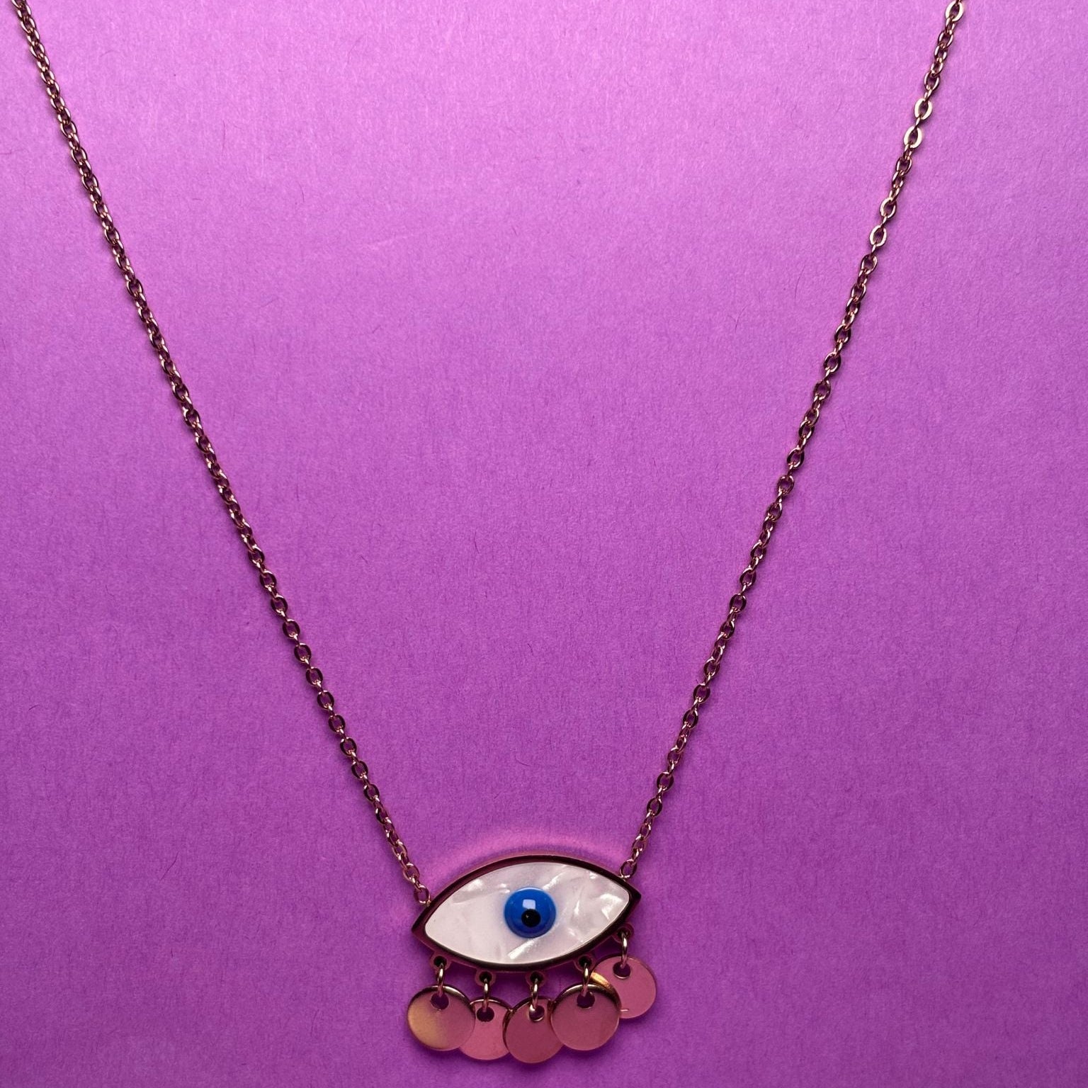 A shell-white eye with a bold blue iris and five blush discs that dance with your every move, this isn’t just a chain, it’s a whole vibe of divine energy and silent strength.