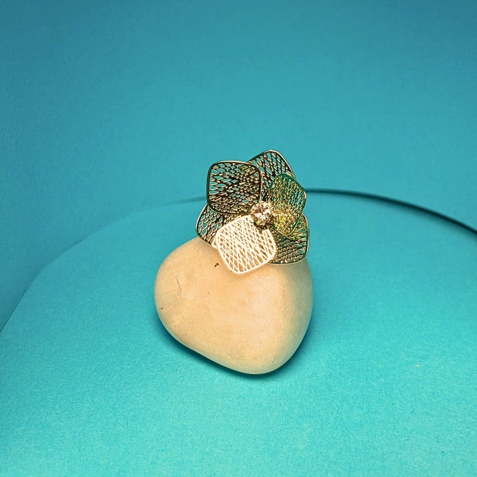 Inspired by the quiet elegance of wild blooms and the fine intricacy of lace, the Petal Lace Ring is a wearable poem. Each petal curves like a whisper, delicately latticed in gold-tone filigree that catches the light with every move. A subtle stone at the centre adds just the right touch of sparkle, never loud, always luminous.
